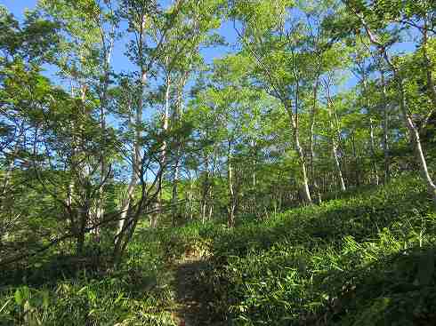 シラカバの森 そこそこの急坂を登っていくと その勾配も少し緩み気持ちのいいシラカバ林になります。 |