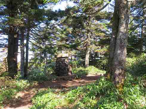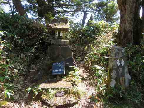 裏志賀山山頂(2,037m) 山頂部の北の端近くまできました。ここには志賀神社の奥社の石祠が祀られています。 表示はありませんがここが裏志賀山の山頂でしょう。 〔裏志賀山山頂 着=10:35〕 |