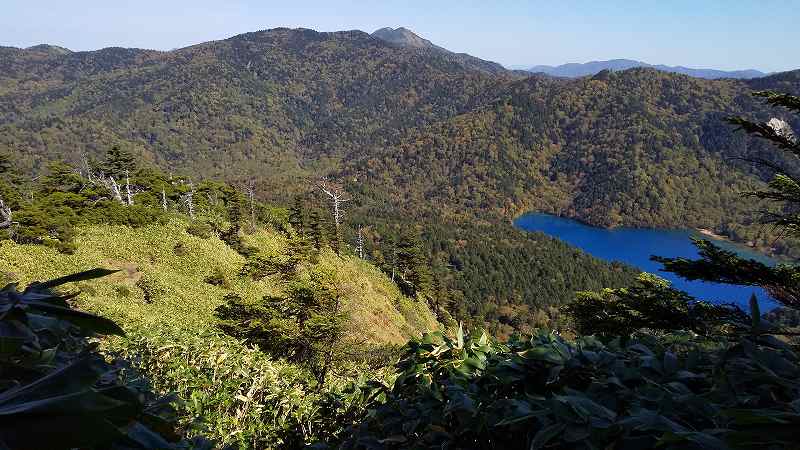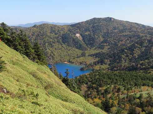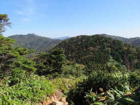 山頂奥からの展望 石祠のあるあたりは木に囲まれていて展望はありません。さらに進んでいくと北側の展望が開けました。 中央奥に岩菅山、右下には真っ青な大沼池が見下ろせました。 さて、ここで簡単な昼食タイムとし四十八池へ行きましょう。 〔裏志賀山山頂 発=10:50〕 |