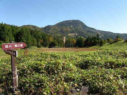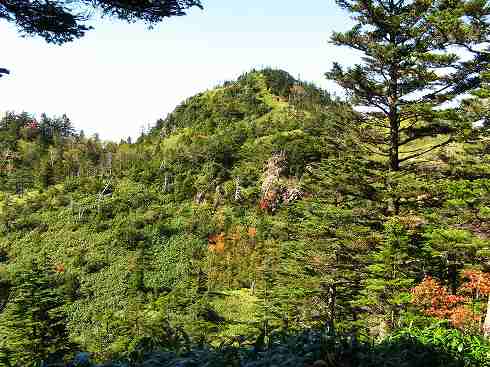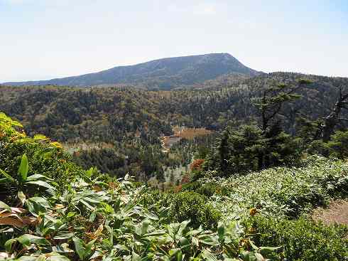 前山湿原と横手山 前山からちょっと下ったところが前山湿原です。 ササの向こうに茶色っぽく見えるところが湿原で、その背後の山が先ほど行ってきた横手山です。 さて、まずは志賀山へ向かいましょう。 |