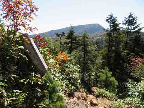妙高山を望む わずかに開けたところから何とか展望があります。 山座同定版によれば、黒姫山・妙高山・火打山のようですね。 〔志賀山休憩展望地 発=9:55〕 |