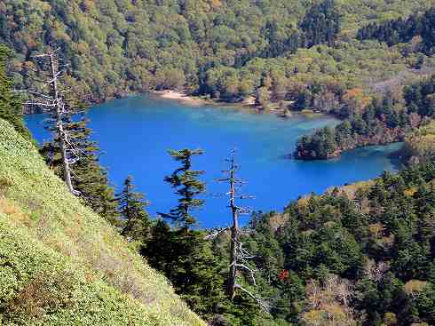 大沼池をズームアップ 大沼池をズームアップして見ましょう。この青色は何と呼べばいいのでしょう。 |