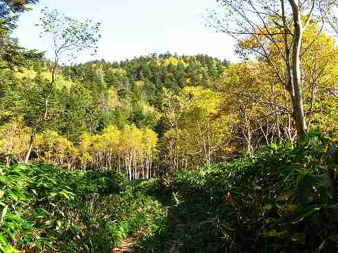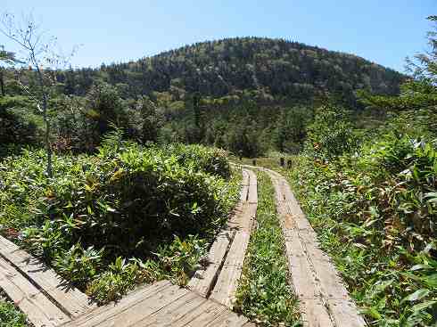 ササ道の向こうに志賀山 道はササの中を行く木道に変わりました。前方に志賀山が見えてきます。 |