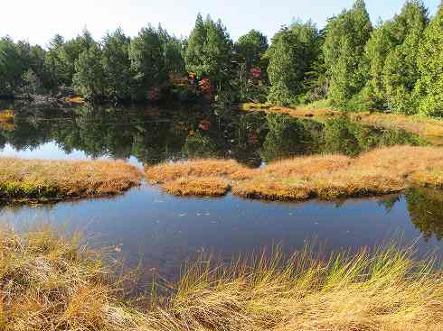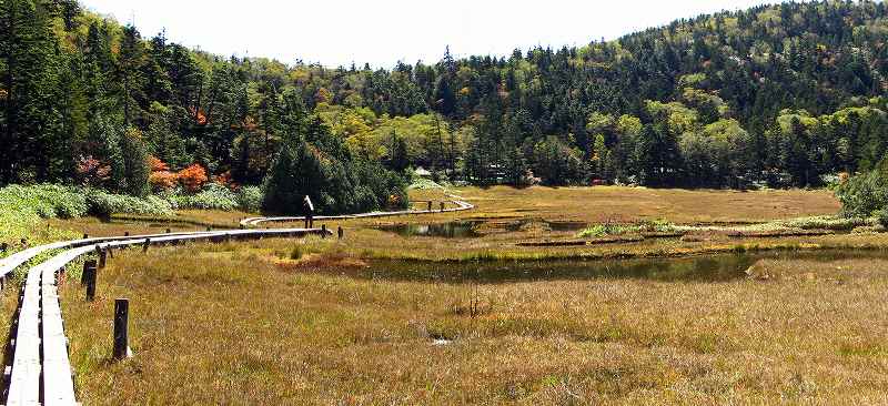 草紅葉に囲まれた大小さまざまな池が点在する四十八池には木道が設置されています。
