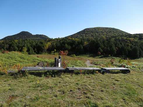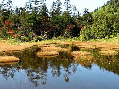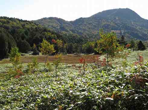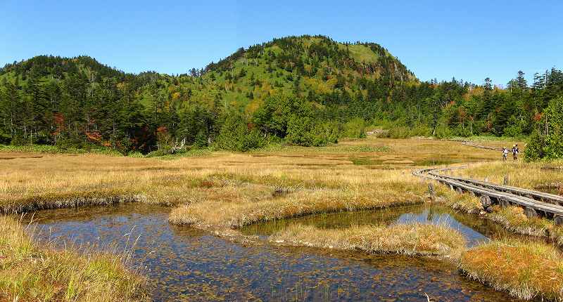 志賀山と四十八池 四十八池の木道を北から南へ歩いてきました。 振り返ってみると四十八池の背後に志賀山(左)と裏志賀山がありました。 緑の山と池を縁取る草紅葉の対比がきれいです。 |