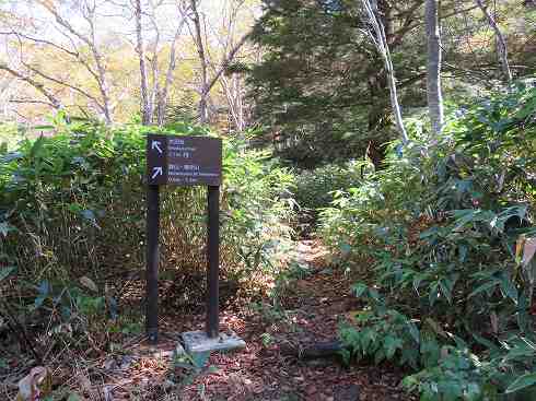 志賀山/四十八池分岐 渋池からさらに遊歩道を行くと分岐がありました。 左へ行くと志賀山で右は四十八池なのでここは左への道を行きます。 〔渋池=9:10〕 |