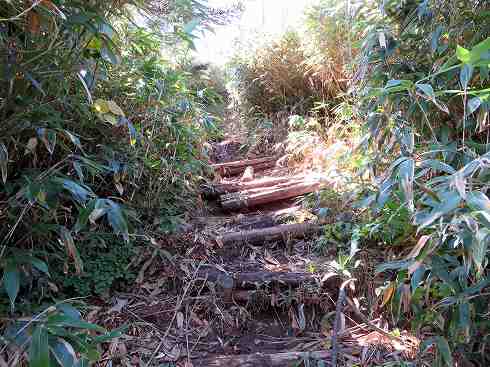 鉢山への登路 鉢山へ登っていく道は荒れた道でした。階段はそこここで壊れかけ、道はぬかるんだところが多いのです。 |