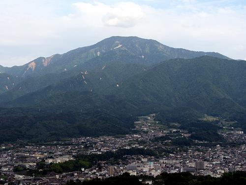 展望台から南東側の眺望 展望台に上がるとなかなかいい景色が広がります。 まずは南東側で、正面に恵那山、その右手前に前山、右奥に焼山、そして中津川の市街地と木曽川の流れを見下ろします。 |