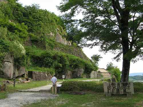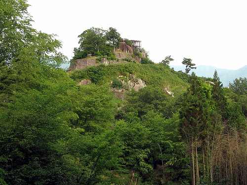 本丸を見上げる 本丸直下まで登ってきました。展望台として櫓が巨岩の上に組まれています。もちろん直登はできず 左から回り込んで登ります。 |