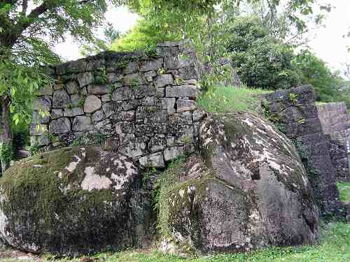 大矢倉 進んでいくと大矢倉跡の石垣が見えてきました。 もともとあった巨岩をそのまま利用して石垣が築かれていることがわかります。 |