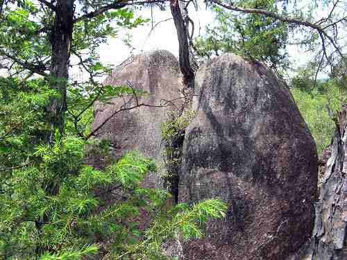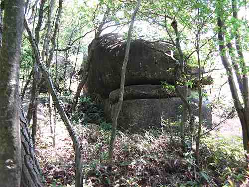 展望岩 ハンバーガー岩の少し上に展望岩がありました。 幅1~1.5m、長さ7・8mある大岩です。この下は崖なので東側の展望が開けるのです。 〔展望岩 着=11:45〕 |