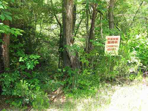 登山口 登山口は林道が90度曲がるところにありました。 登山口の表示はなく、この注意書き看板のところから左へ入っていきます。 |