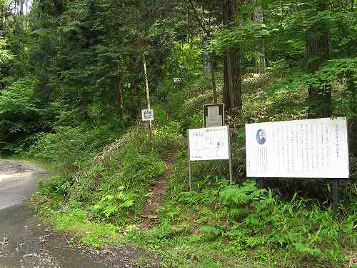 高峰山登山口 ちんの峠から少し下った林道の交差するところが高峰山登山口。ここにも3台ほど車が置ける駐車場がありました。 |
