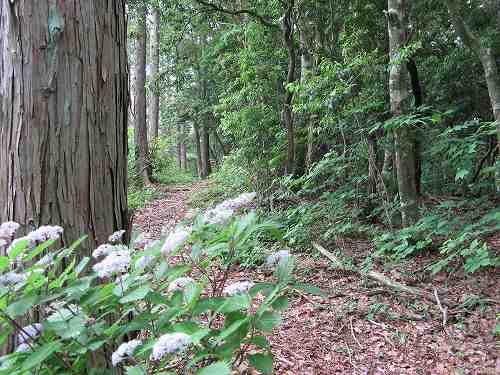 コアジサイの咲く登山道 緩やかな道になってもずっと林の中で展望は一切ありません。青色や白っぽいコアジサイが咲く道をひたすら歩いていきます。 |