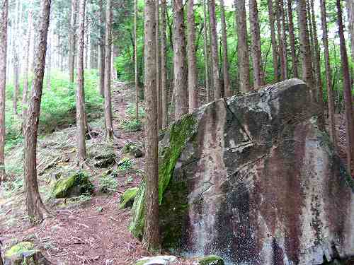 割れ岩 展望岩からはヤブっぽいところを抜け、岩場を下ります。 そして 私がいうところの天狗のサイコロの巨岩を右に見ながら下ってくると二つに割れた大岩がありました。登って行くときにも 見た記憶がある岩で、割れ岩とでも勝手に呼ぶことにしましょうか。 〔巨岩(天狗のサイコロ?)・割れ岩=12:55〕 |