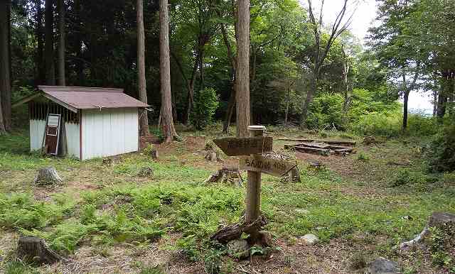 山頂風景と観音堂 広い山頂風景はこんな感じ。 左の建物が観音堂で、右奥が若干開けていますが・・・ |