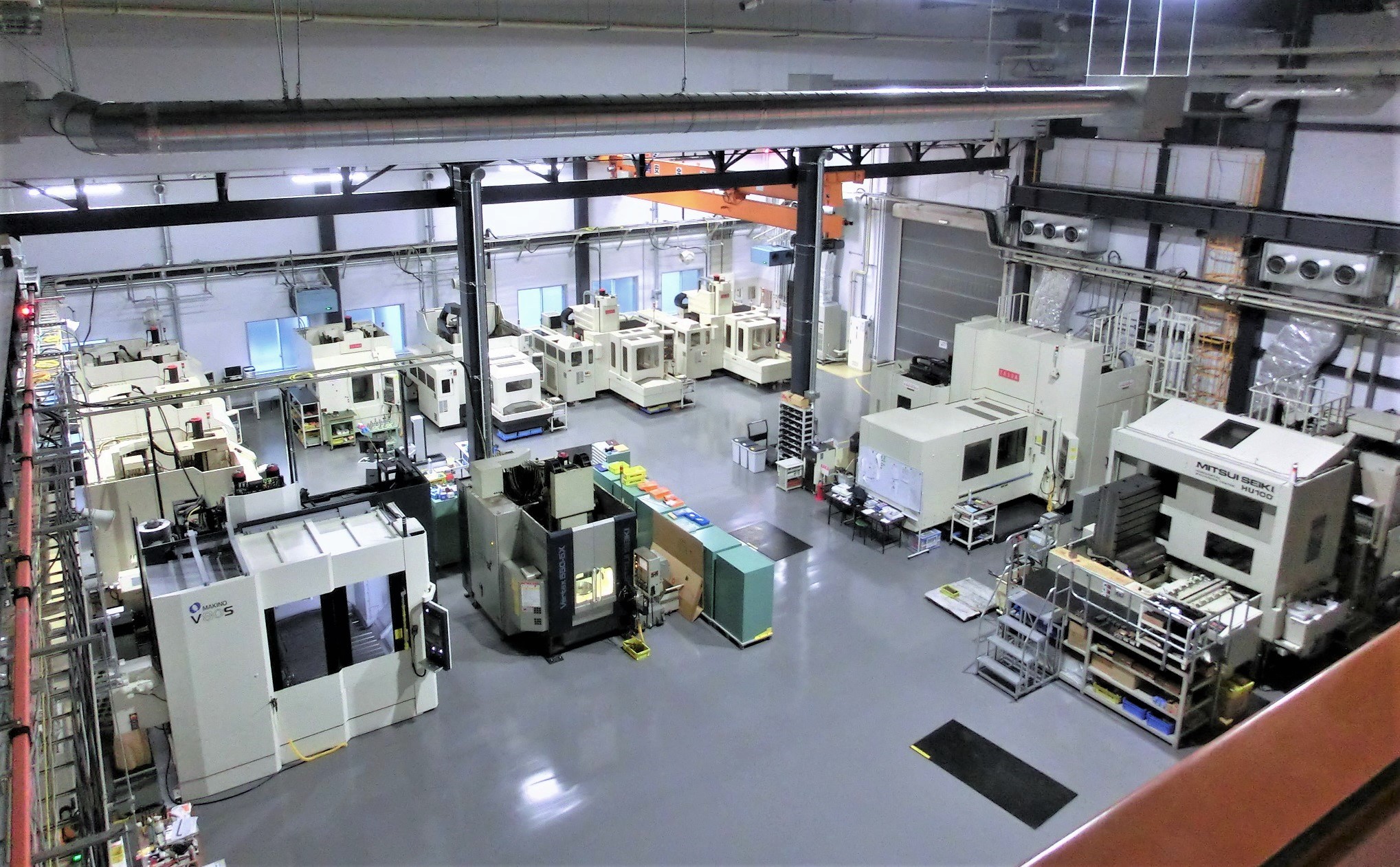 工場内温度を一定に保つことのできる環境の中にCNCジグボーラー 8台(最大X1800㎜Y1200㎜Z800㎜)と、横型マシニング センター 2台(パレットサイズ□1000㎜)及び、5軸マシニングセンター2台