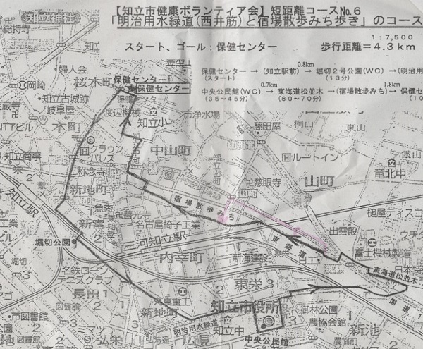 往路ルート:自宅〜1.8Km〜保健センター〜明治用水緑道歩き 4.3km〜保健センター〜1.8Km〜自宅 合計歩行距離 7.9Km |