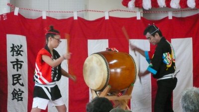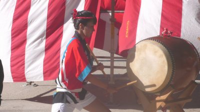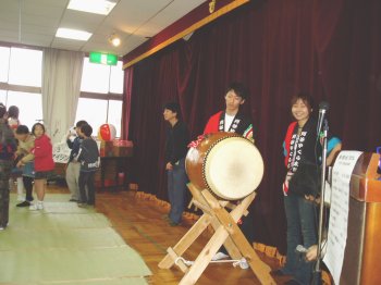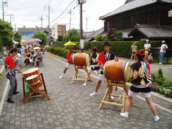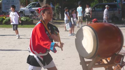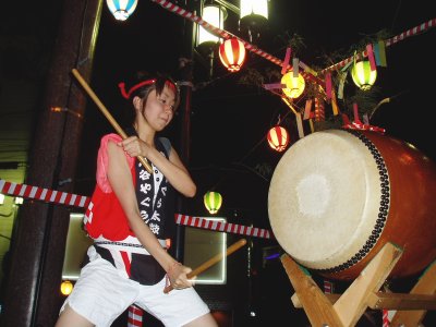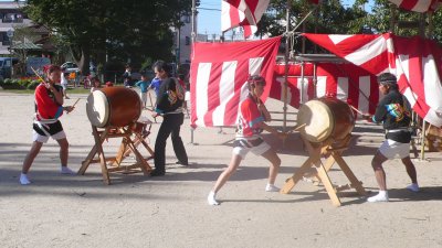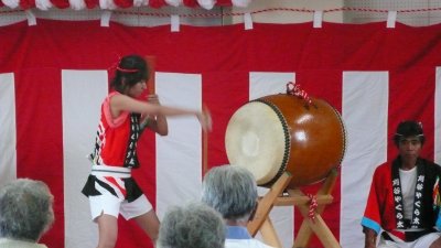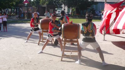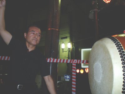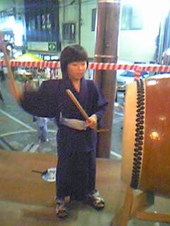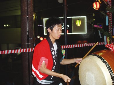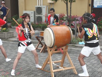 毎年盆踊りの新曲が2〜3曲出て叩き辛い曲が多いんですが今年は2曲共叩きやすい曲でした。 ←このイベントの参加が最後で月末には海外へ行ってしまう榊原です、無理を言ってアチコチの演奏を手伝ってもらいました。 |