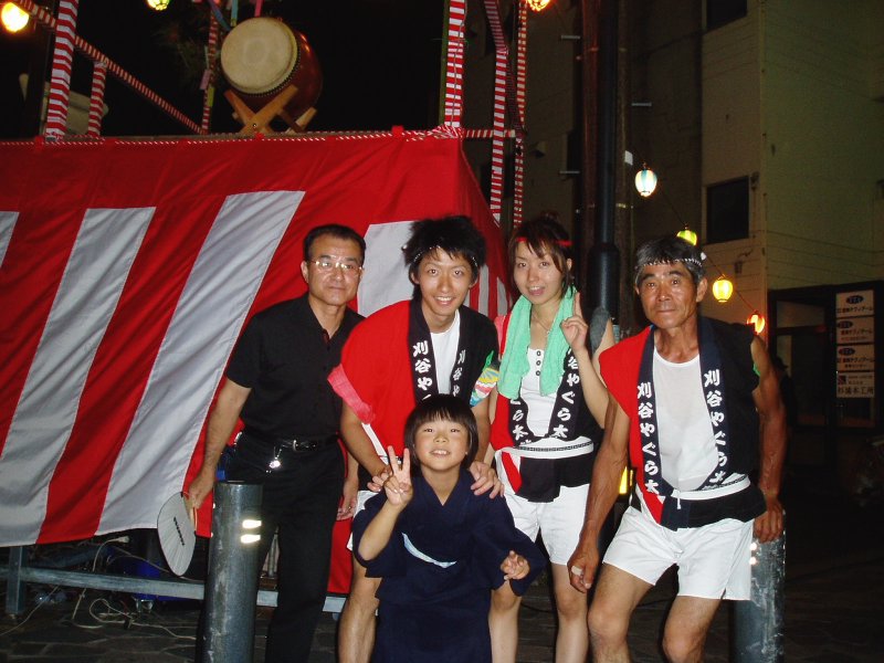 踊りの休憩中にやぐらの下でパチリ 左から神谷さん・榊原・手前 和貴・本澤・酒井、昼間はとんでもない暑い日でしたが日没とともに少し風も出て良い日になりました。