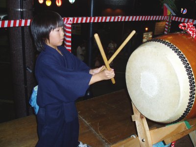 ⇔ 万燈祭りに今年初めて参加してチャラポコを強弱・間を大人顔負けに叩いた”和貴”です、盆太鼓も初めてですが一度も音が外れずに叩いています。 凄い 天才的です。 |
