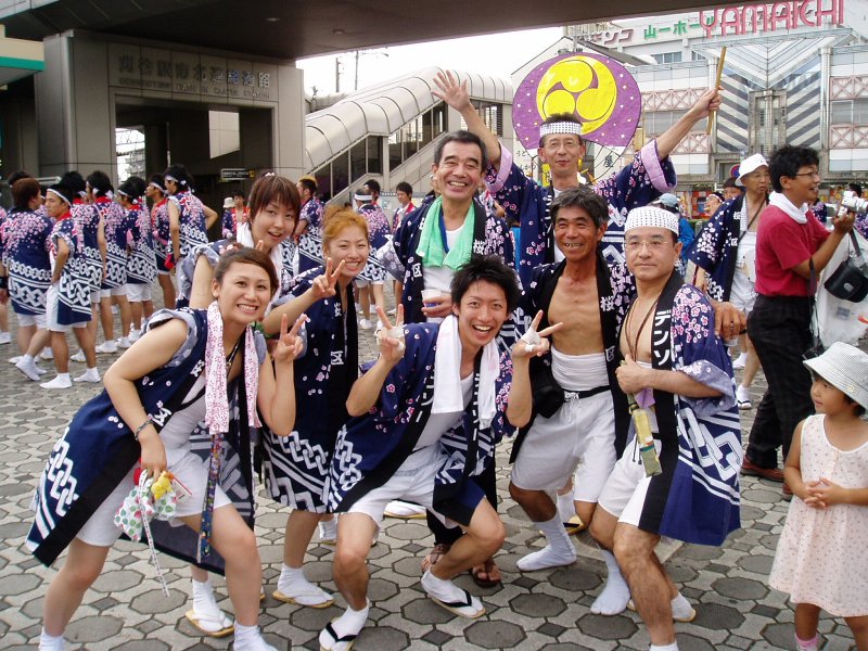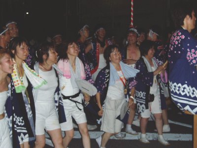 | ”舞い”も盛り上がっていましたね、その盛り上がりの真中には何時も家のメンバーがいました。 →輪になって踊ってる左から前田・本澤・松居さん・?御免なさい・原田さんの友人・荒尾さん。 |