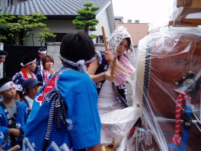 | 13.00出発の前におかしな雲が出て万燈・太鼓等にビニールを掛けて始めました、太鼓はまだ良いんですがせっかくの万燈が見えないのが寂しいですね。 →丁度雨がぱらついてほっかむりして打つてる”内”です。 |