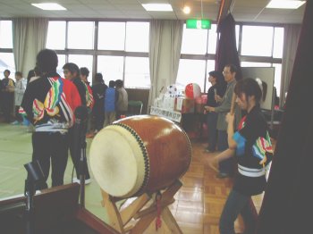 | 演奏終了後 皆で踊ろうに飛び入り参加で・・太鼓 本澤、左手では踊りに参加の酒井・大ちゃんです。 | 曲の合間に寛ぐ 左、大ちゃん・右、みきちゃん。 |