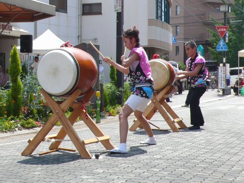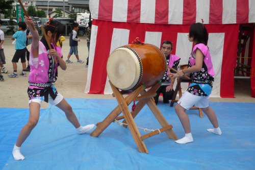 メンバーのアクシデントで急遽ピンチヒッターの私と本澤での”組太鼓”です。本澤は暑い中思いっきり長時間の”自由打ち”をしてくれました。 もうボツボツバテ気味です。 |