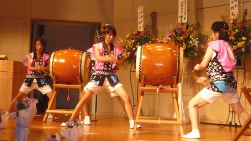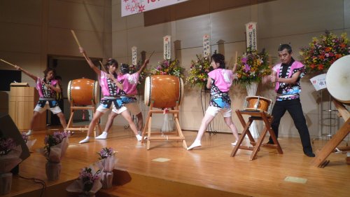 地元のカラオケグループの記念発表会がありオープニングの演奏に行ってきました。 10分間の演奏ですので編曲して演奏しました。 ←内・本澤の組太鼓から演奏が始まります。 |