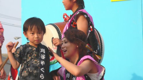 ”子供太鼓体験・撮影会”でステージに上がった子供に法被を着せてる 内です。