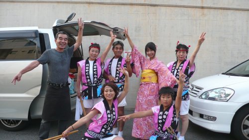 ステージが終了して記念撮影 まだこれから”盆踊り”のやぐら上での太鼓が残ってます。 誰だ仕事着のままで一緒に写ってるのは! |