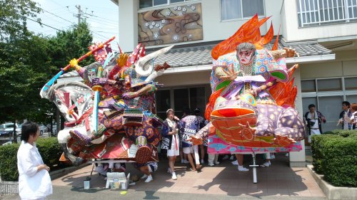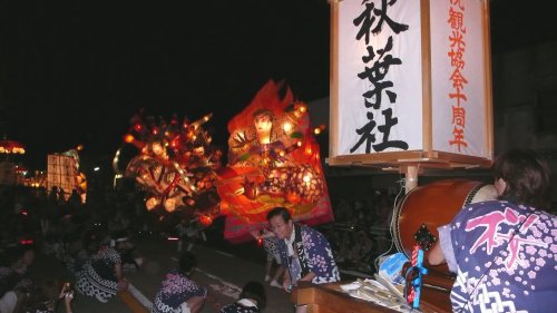 昼”町曳き”の準備です。 左が”巴御前”右が”地雷也”デンソーOBによる新作です。 桜市民館にて。 |