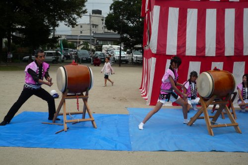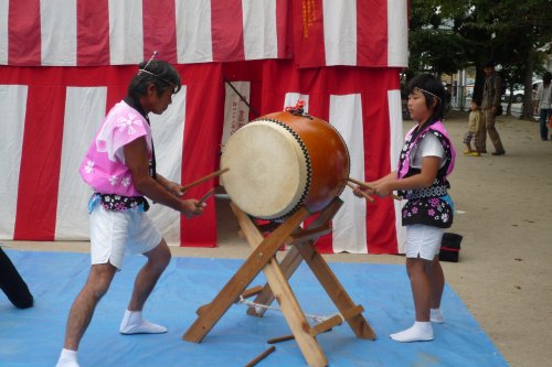 今年も参加させて頂きましたフェステバル、曇り空でしたが皆のパワーで雨を降らせず無事に出来ました。 ←”ゆうきち”を演奏してる本澤と和貴です、お借りした太鼓の皮が緩んでいて大変でした。 |