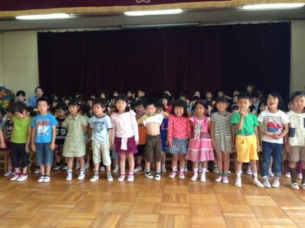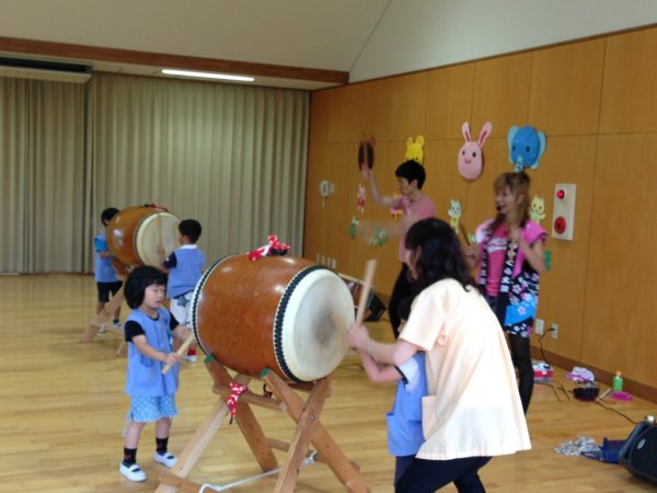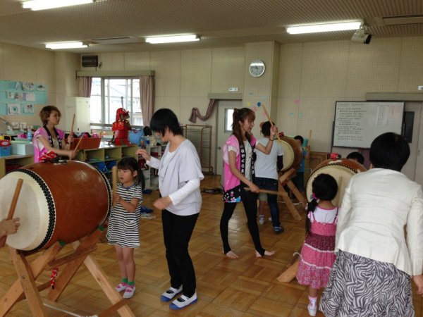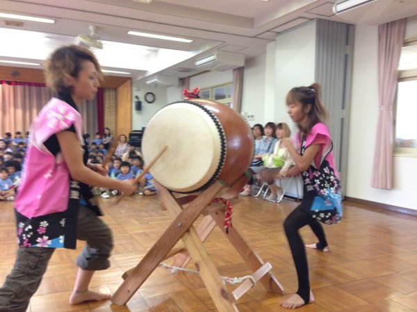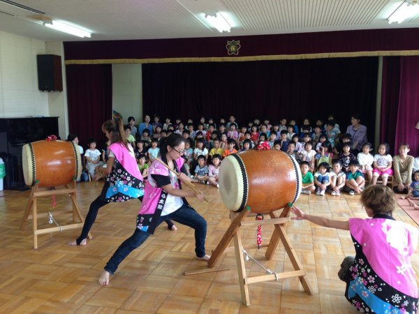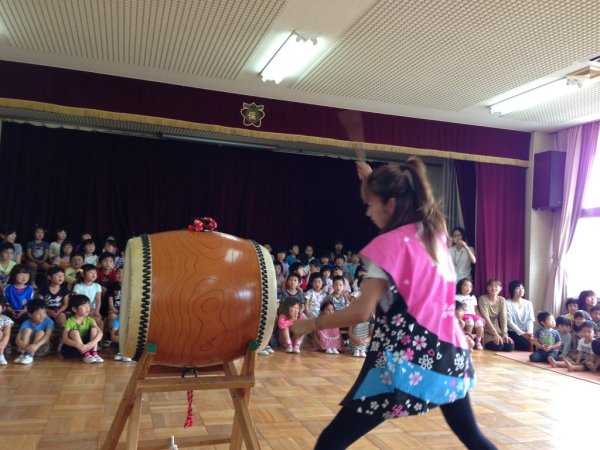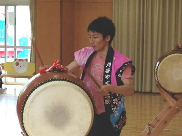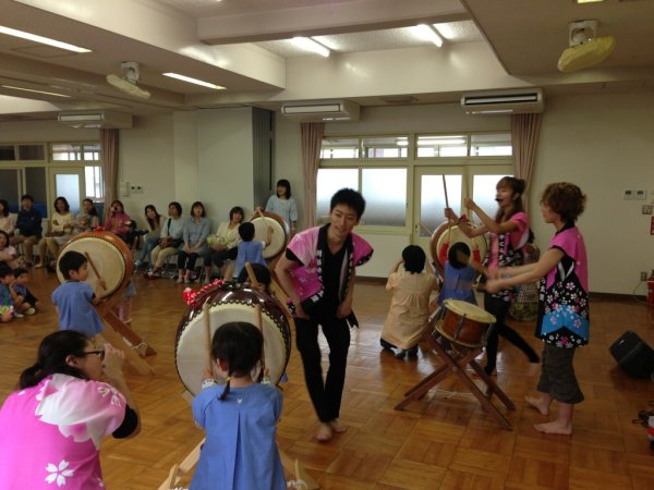 衣浦幼稚園にも今年で二回目、誕生会の出し物?30分の演奏と園児年中年長80名以上?の太鼓体験で園児に楽しんでもらいました、帰国中の大ちゃんは一曲フルにたたいてもらい途中でばてていました(笑)