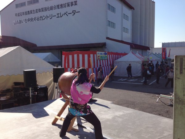 | 今年で3回目ですが前回は台風で太鼓は中止、今回はメンバーの都合が悪くて麻里と私の二人で演奏して来ました、ステージの上にフェルト?が張ってあって前日の雨?朝の露?でしっかり濡れてて足袋からズボンの裾までしっかり濡れて冷たかった(笑)演奏時間20分ほどでしたが麻里が頑張って農業際のオープニングを上手く演奏でお客さんを集めることが出来ました。 |