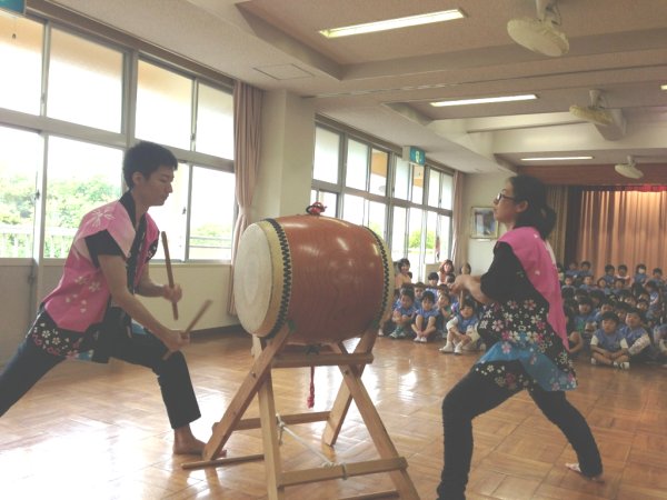 昨年に続き今年も行って来ました、30分の演奏、そして年長さん32名が太鼓体験、そして演奏のお礼にと園児たちが大きな声で歌を歌ってくれました!