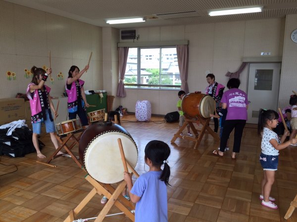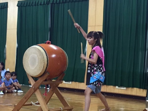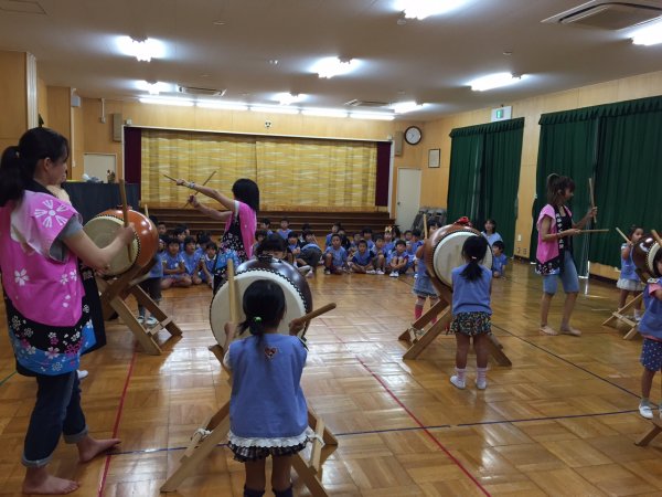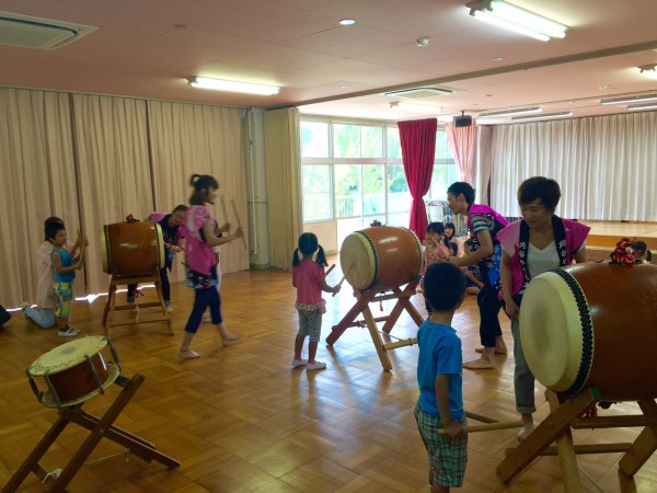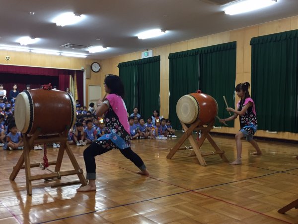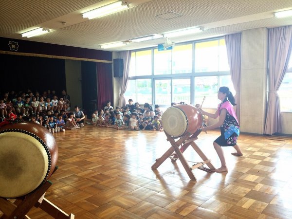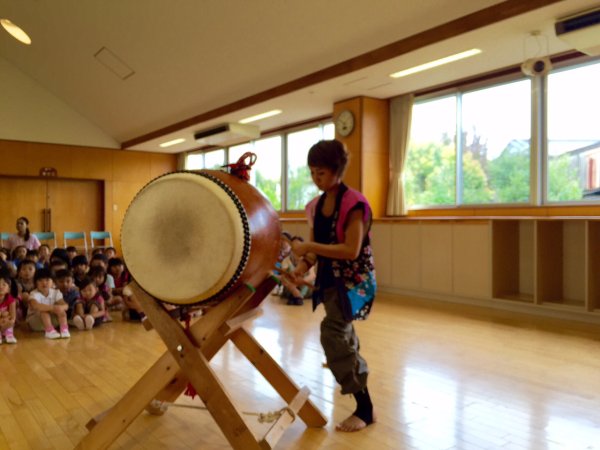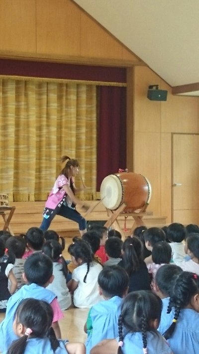 幼稚園の夏休み中の誕生日会に行って来ました、今回は園児の太鼓体験は無しです、今回もリーダーの構成で園児達の知ってる曲を演奏して喜んでもらいました、写真が撮れなかったので二枚だけです。