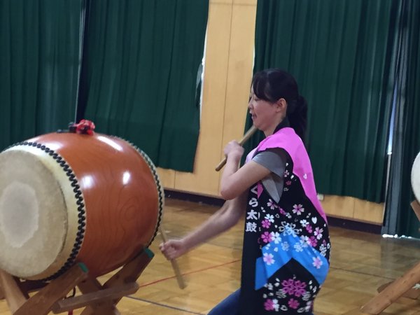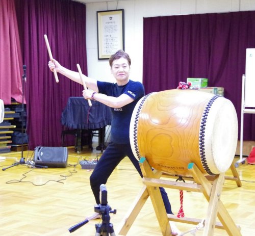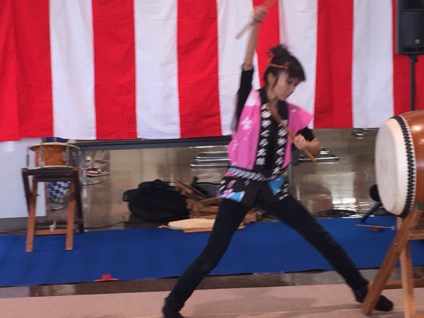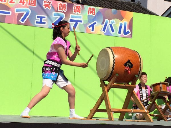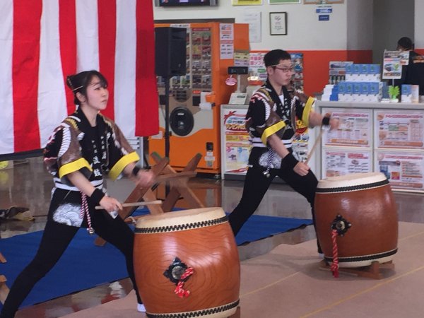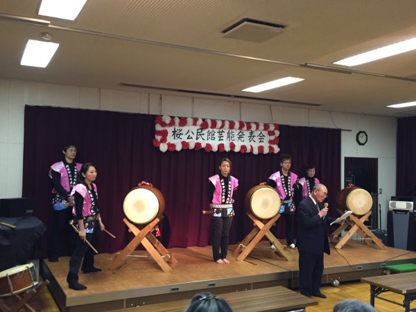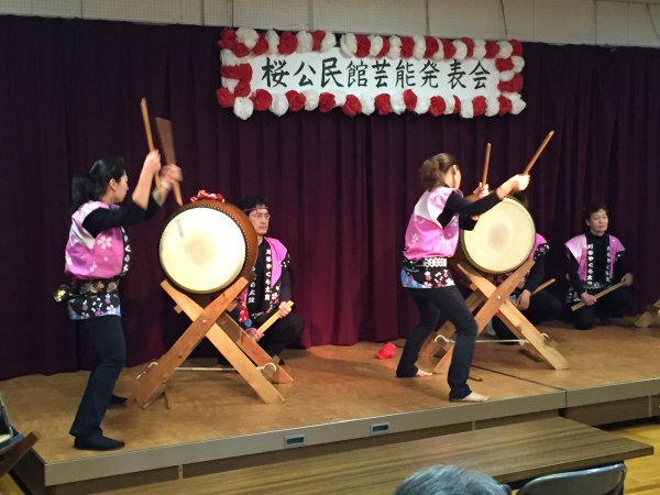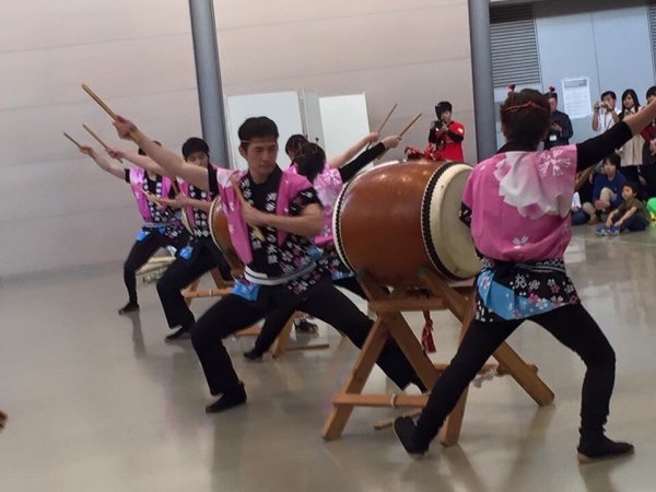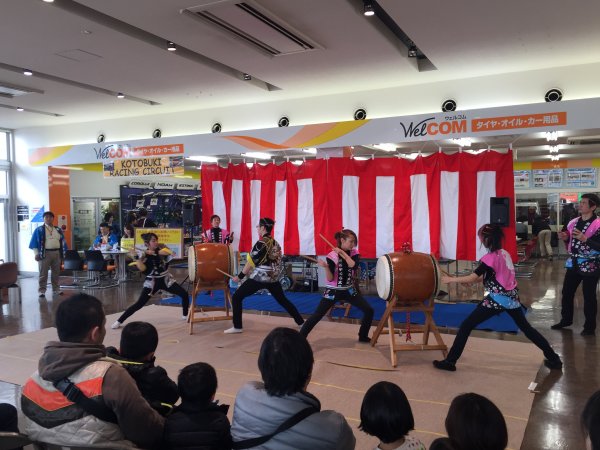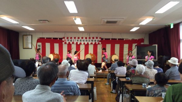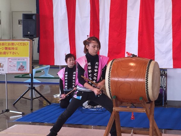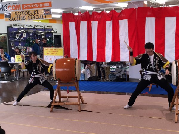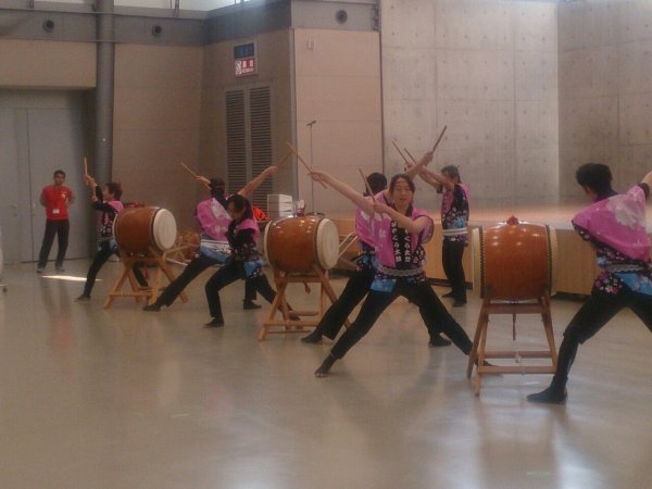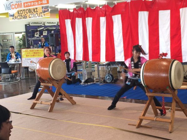 桜区は10時40分何時ものように祝辞が長引き(笑)15分遅れ何時もの練習場で成れた物ですが、舞台が狭い為に〆太鼓二つが舞台の前、置けずにテーブルを1つ下げてもらいお客さんの目の前に〆太鼓、10分間ですので2曲でしたが終わるたびに左後ろの大勢のグループ?が凄く大きな拍手と歓声で盛り上げてくれ楽しく終わることが出来ました。 ありがとうございました!