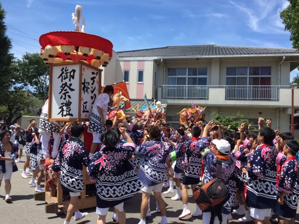 町曳き前に 若頭の山車乗りで一気に盛り上がります |