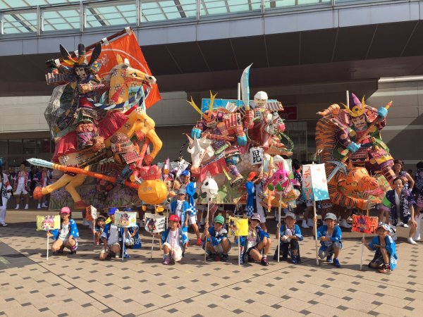 みなくる広場で 大中小の万燈前で記念写真の子供舞メンバー |