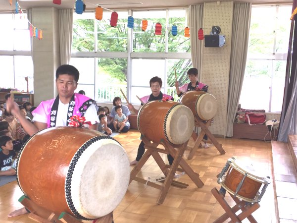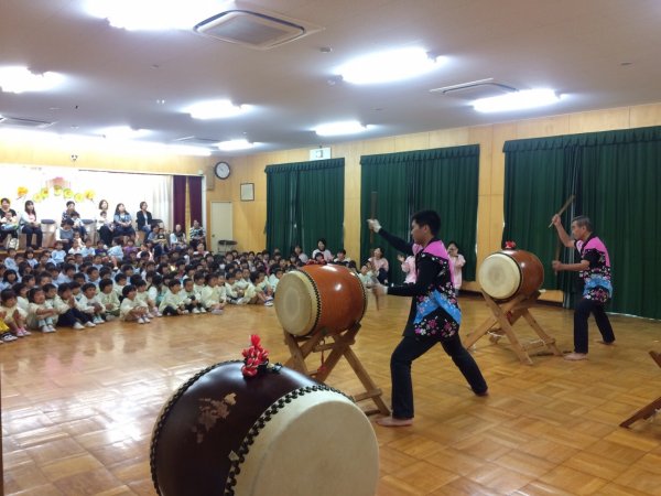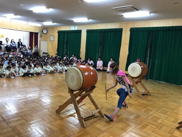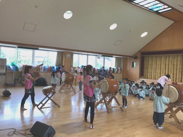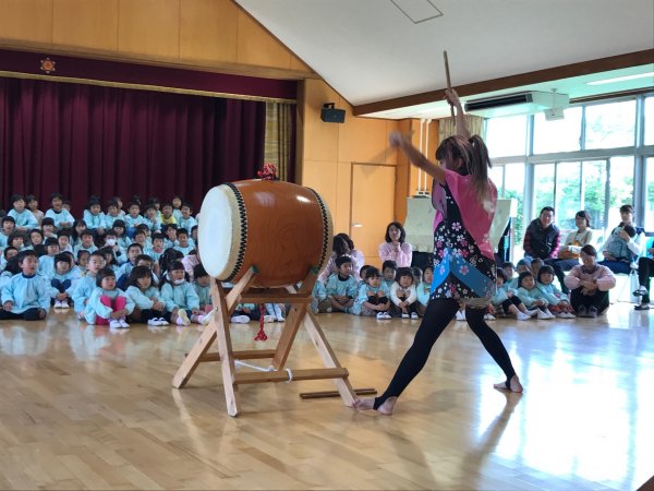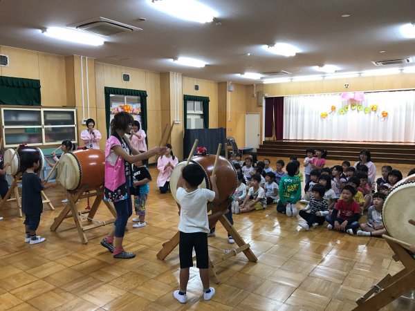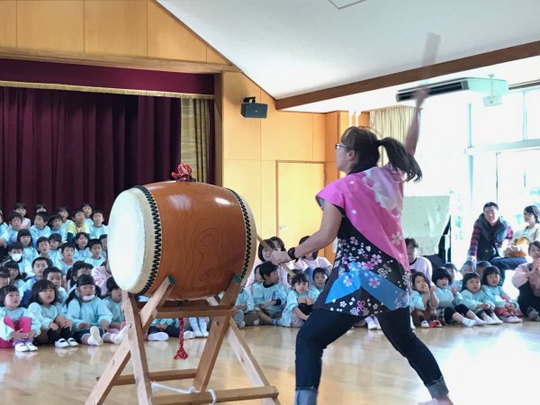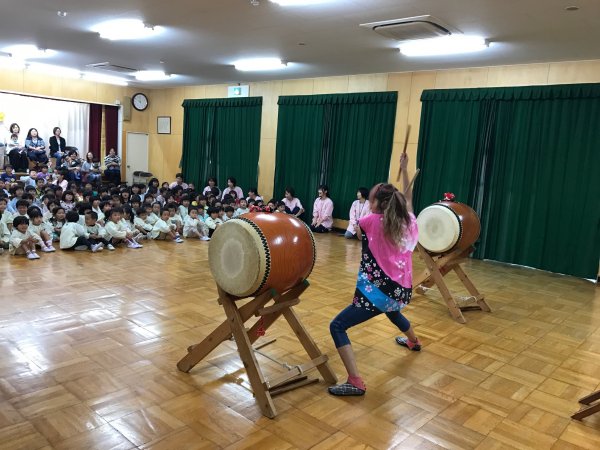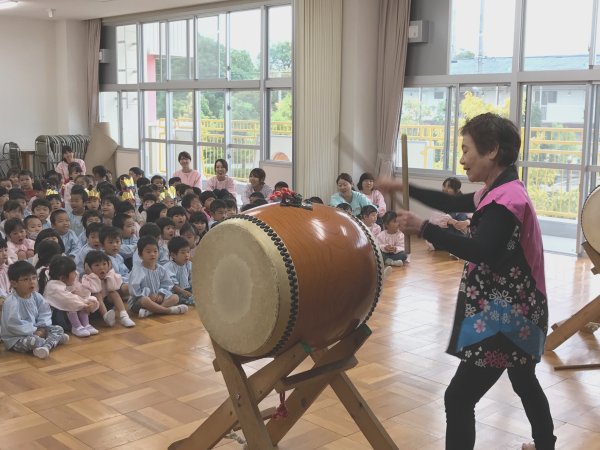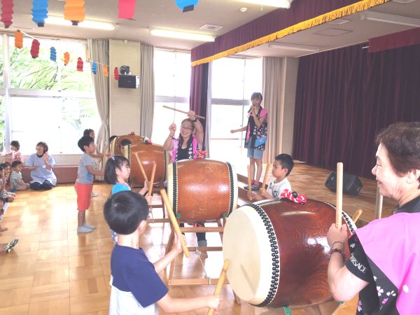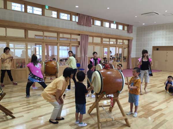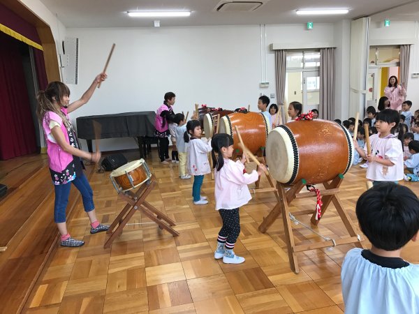 太鼓体験で楽しむ年長さん |