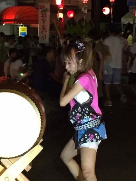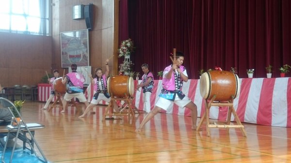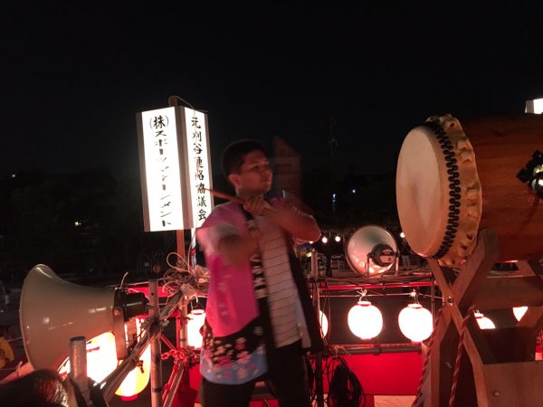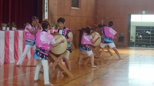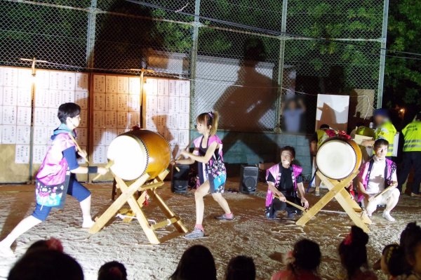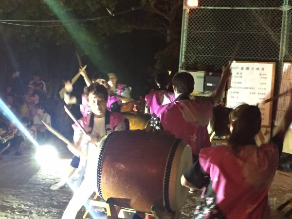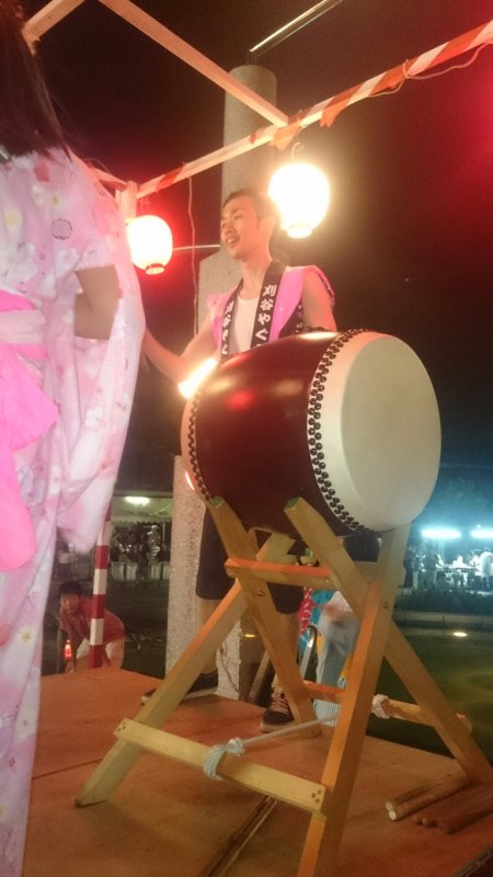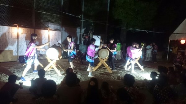 ´艸`)私達は何とか25分程の演奏を終了できました、夜は是も恒例の盆踊り、やぐらの上での太鼓です、メンバーの半数は原崎地区の盆踊りのお手伝いで万燈祭等で親交のある神谷さんにもお手伝いいただいて無事に終わりました。