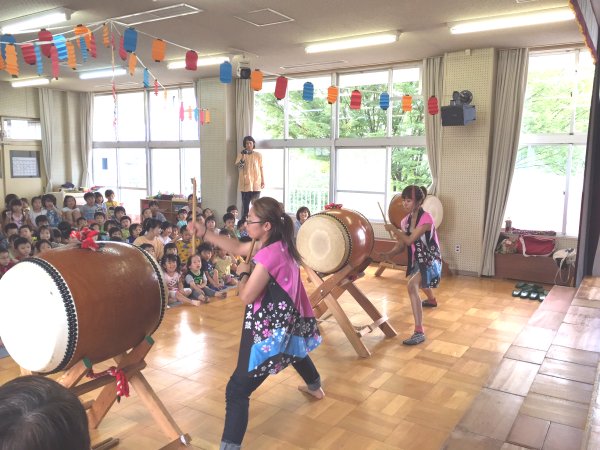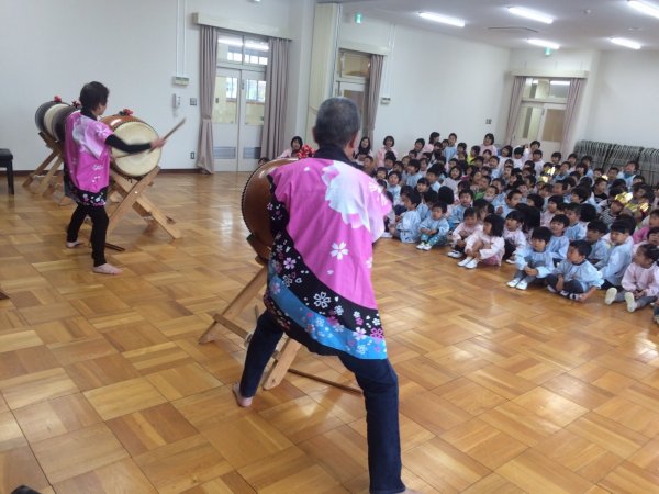 | 組太鼓をマリとミキ、園児の真剣な顔 |