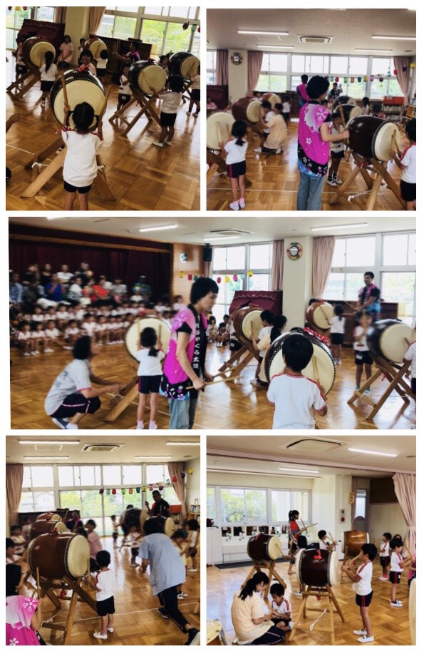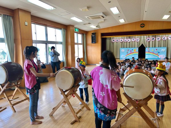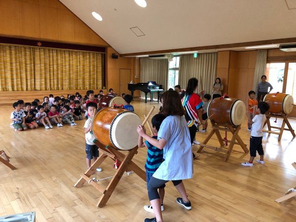 | 誕生会の主人公の太鼓体験です | 年長さんの太鼓体験、皆上手でビックリ! |