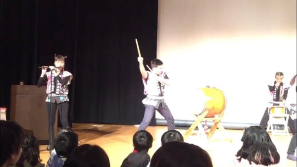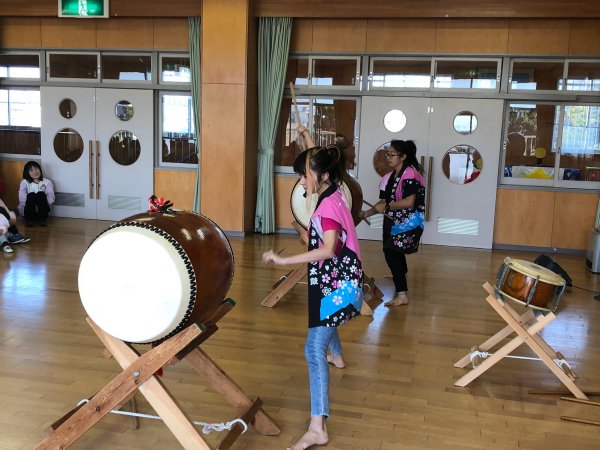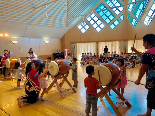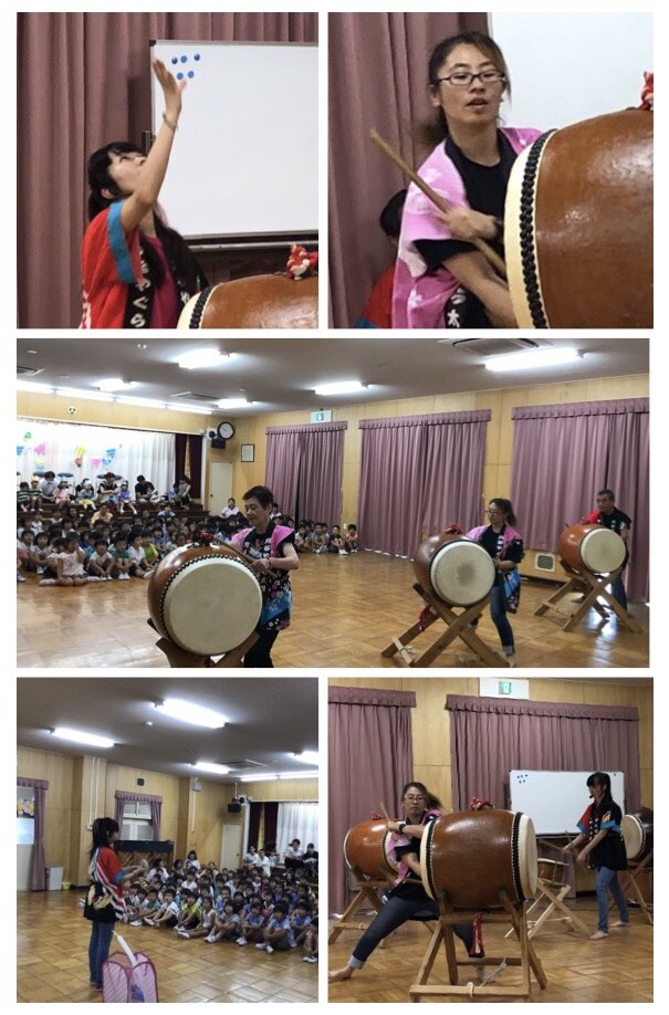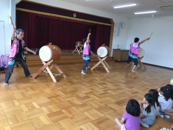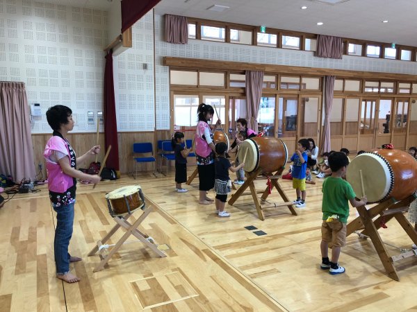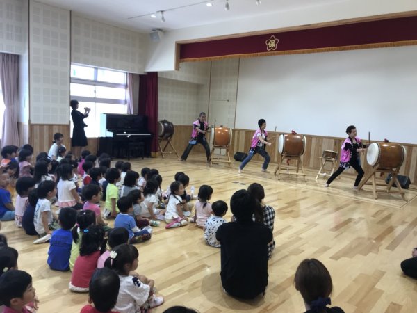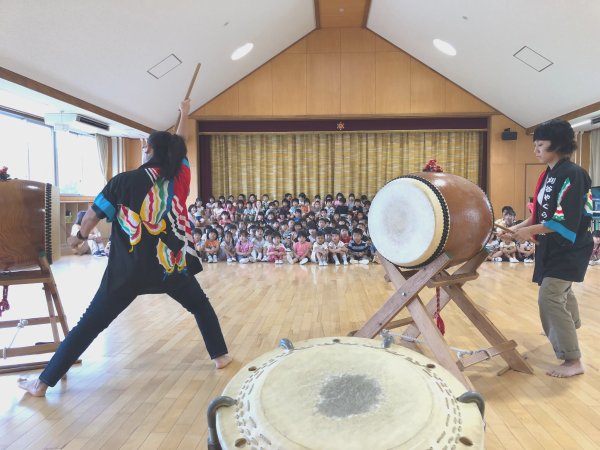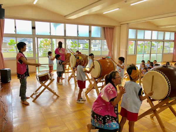 | ヒイナ 踊るポンポコリン演奏中 | 年長さんの太鼓体験が始まりました |