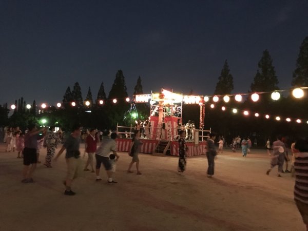 | 凄く広い公園での盆踊りです | 休憩時間の演奏 照明もリーダーの商売道具 |