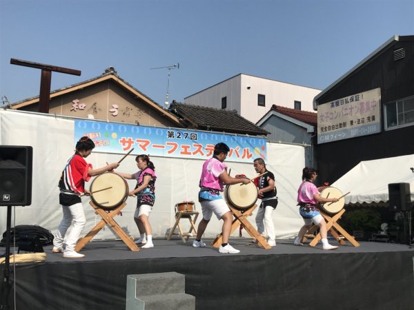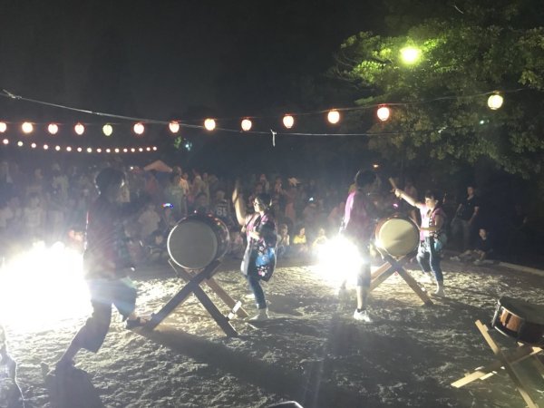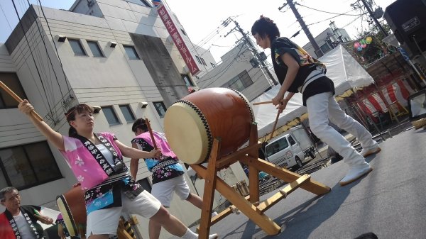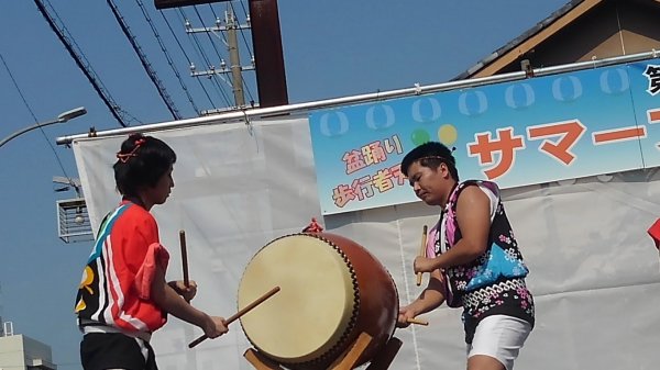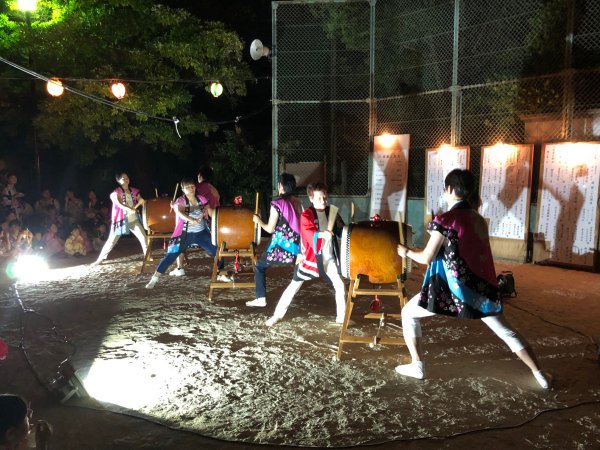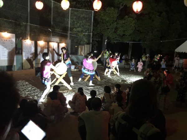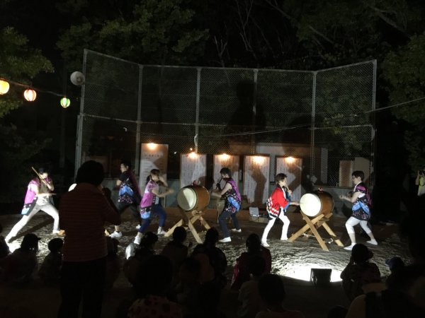 | 今年も声をかけていただきました、昨年は台風で中止になってしまいましたが今年は二日共に 無事開催出来ました、こちらには4人で(飛び入りでカエも?)やぐら上の盆太鼓と休憩時間の 演奏です、結構な人出だったようです、リーダーは終了後今川町の盆踊り練習にも参加でした。 |
