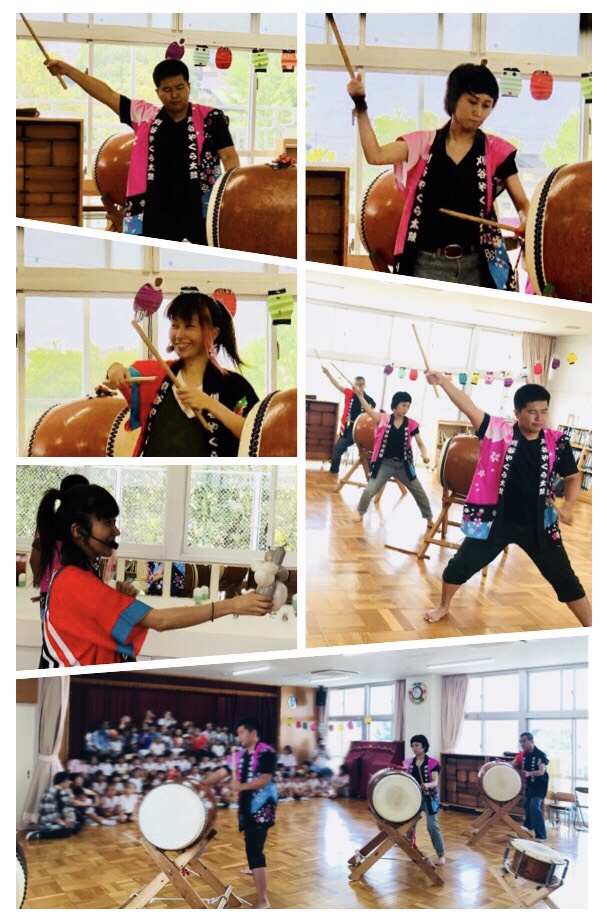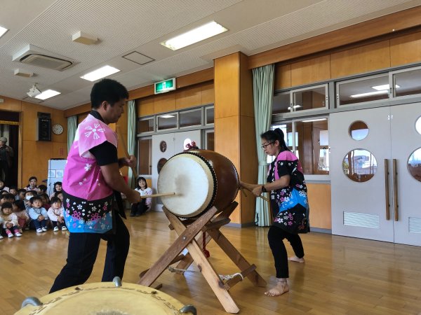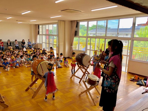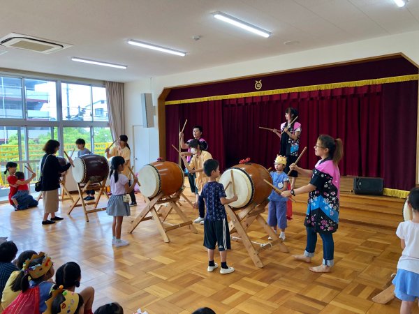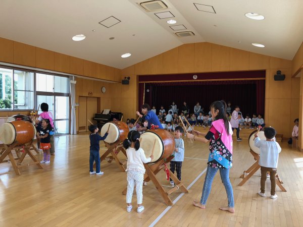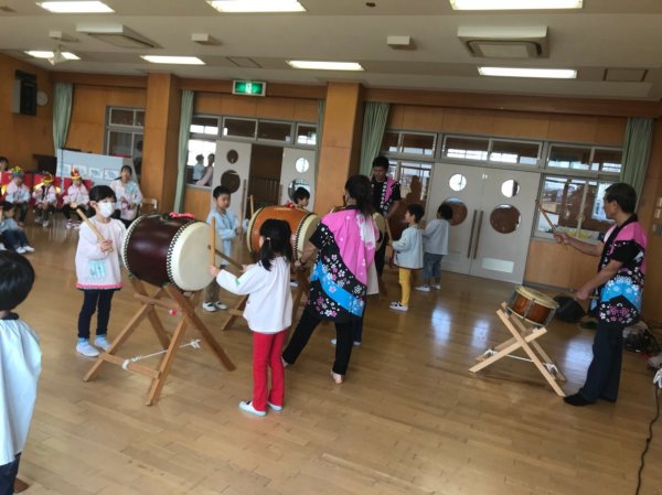 | 今年は幼稚園保育園共に先生方の移動が沢山あったようで別の園で呼んでいただいた 先生から移動先で声をかけてくれるなんてのも増えています、こちらの幼稚園も3度目かな? 5人で行ってきました、演奏中には一緒に歌ってくれたり、踊ってくれたり凄く盛り上げてくれ アンコールも頂き68人の年長さんに太鼓体験をしてもらいました、又呼んでくださいね。 |