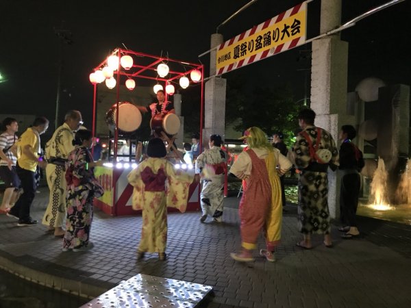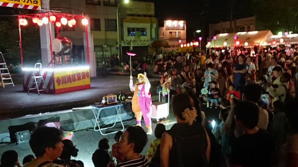 | こちらの盆踊りもリーダーからの口利きで、もう数回目です 12日には盆踊りの休憩時間に 太鼓演奏があったのですが、残念ながら凄い雷で中止になってしまいました( ;∀;) 13日は盆太鼓のお手伝いにメンバーがお邪魔しました、休憩時間は ピエロのラムネちゃんが 盛り上げたようです、今年の異常気象屋外のイベントはやきもきしましたね。 |